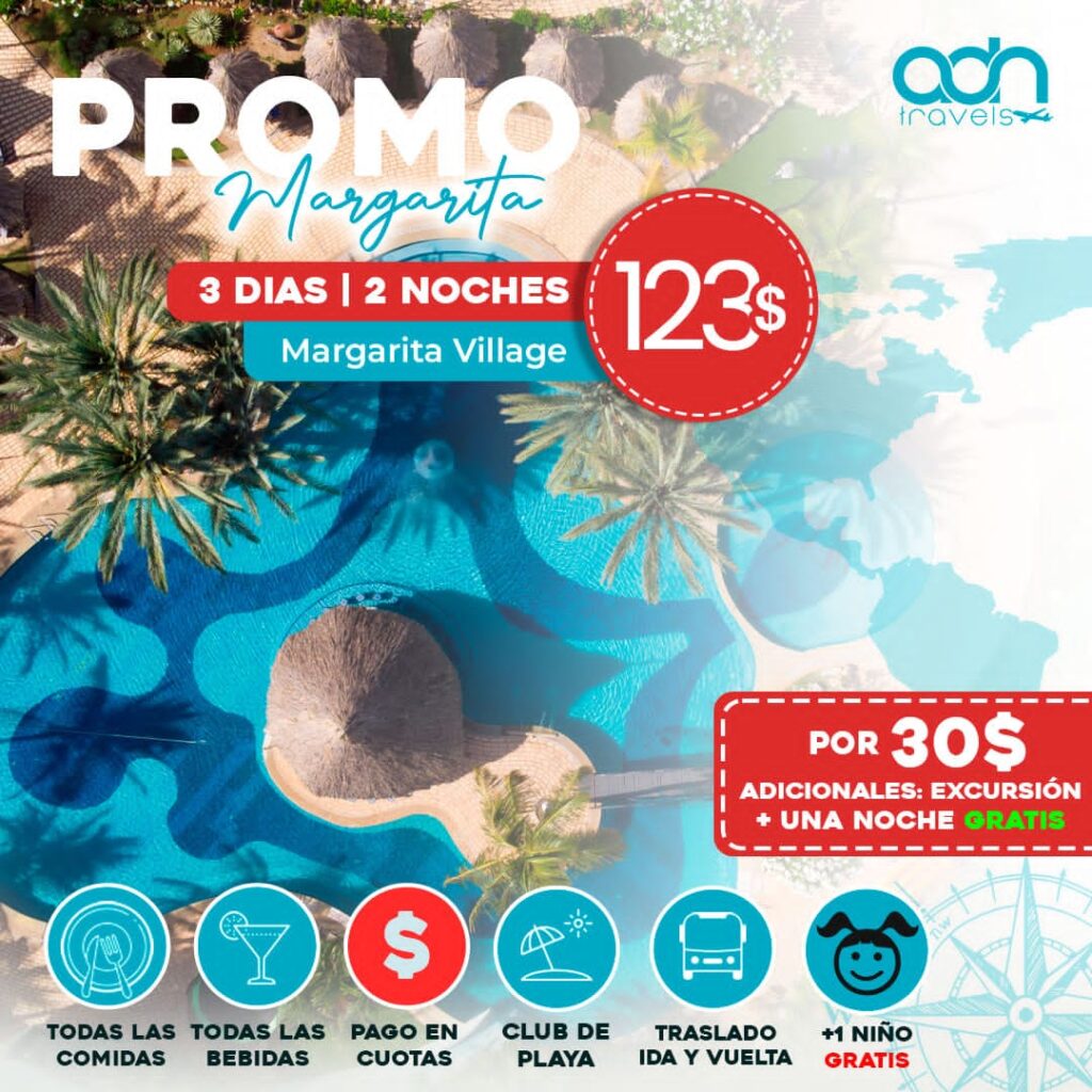 La promo/paquete “Margarita Village” incluye ⏬: 🚗TRASLADO AEROPUERTO – HOTEL / HOTEL- AEROPUERTO EN UNIDAD VIP🏨HOTEL: HOSPEDAJE 3 DÍAS Y 2 NOCHES🏝 Hotel de Ciudad todo incluido🍽Todas las comidas: desayunos, almuerzos, snack, cenas. 🍻 Todas las bebidas alcohólicas y no alcohólicas nacionales. 🏖 Playa, club de playa, piscina con tobogán.👨👩👧👦 Sala de juegos 🛝 Parque infantil🥳 Actividades de entretenimiento diurno y nocturno. ✅ Hotel de Ciudad con maravillosas instalaciones y múltiples atractivos, WiFi, música y muchísima diversión 🥳💵 Todo por 123$ por adulto (el paquete completo 🤯).Niño GRATIS en Hotel🏖💰 Disfruta de nuestro pago en cuotas.Promo válida para su disfrute hasta el 21/12/2025Si deseas viajar en otra fecha puede hablar directamente con un asesor vía WhatsApp.✈Consulta por los boletos aéreos. Contamos con los mejores precios en boletería.